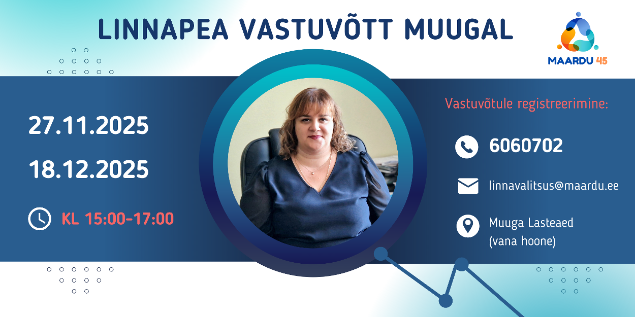 10.11.202527.11.2025 ja 18.12.2025 kl 15.00-17.00 võtab Muuga elanikke vastu Maardu linnapea Aurika Sin-Kerra. Vastuvõtule palume eelnevalt registreerida telefonil 6060702 või e-postil linnavalitsus@maardu.ee. Kohtumised toimuvad Muuga Lasteaias, sissepääs ... Loe edasi »